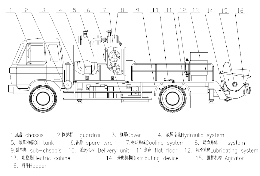 選用國內(nèi)質(zhì)量領(lǐng)先的東風(fēng)底盤,采用世界品牌濰柴道依茨柴油機(jī)作為動力,德國進(jìn)口的力士樂油泵,電氣元件選取也均為國內(nèi)外行業(yè)知名品牌,是一款動力性能好、操作簡單可靠、吸料性強(qiáng)、散熱大的車載式泵車。