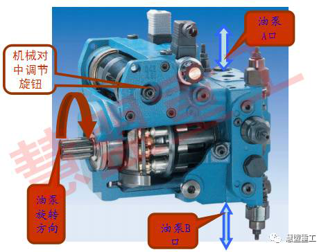 3:當(dāng)如圖泵是順時(shí)針轉(zhuǎn)動(dòng)狀態(tài),且A油口出油,則松開機(jī)械對(duì)中鎖母,緩緩向外旋動(dòng)調(diào)節(jié)桿至油缸活塞桿靜止鎖定,再鎖定調(diào)節(jié)桿鎖母;如是B油口出油,則應(yīng)向內(nèi)旋入調(diào)節(jié)桿操作。